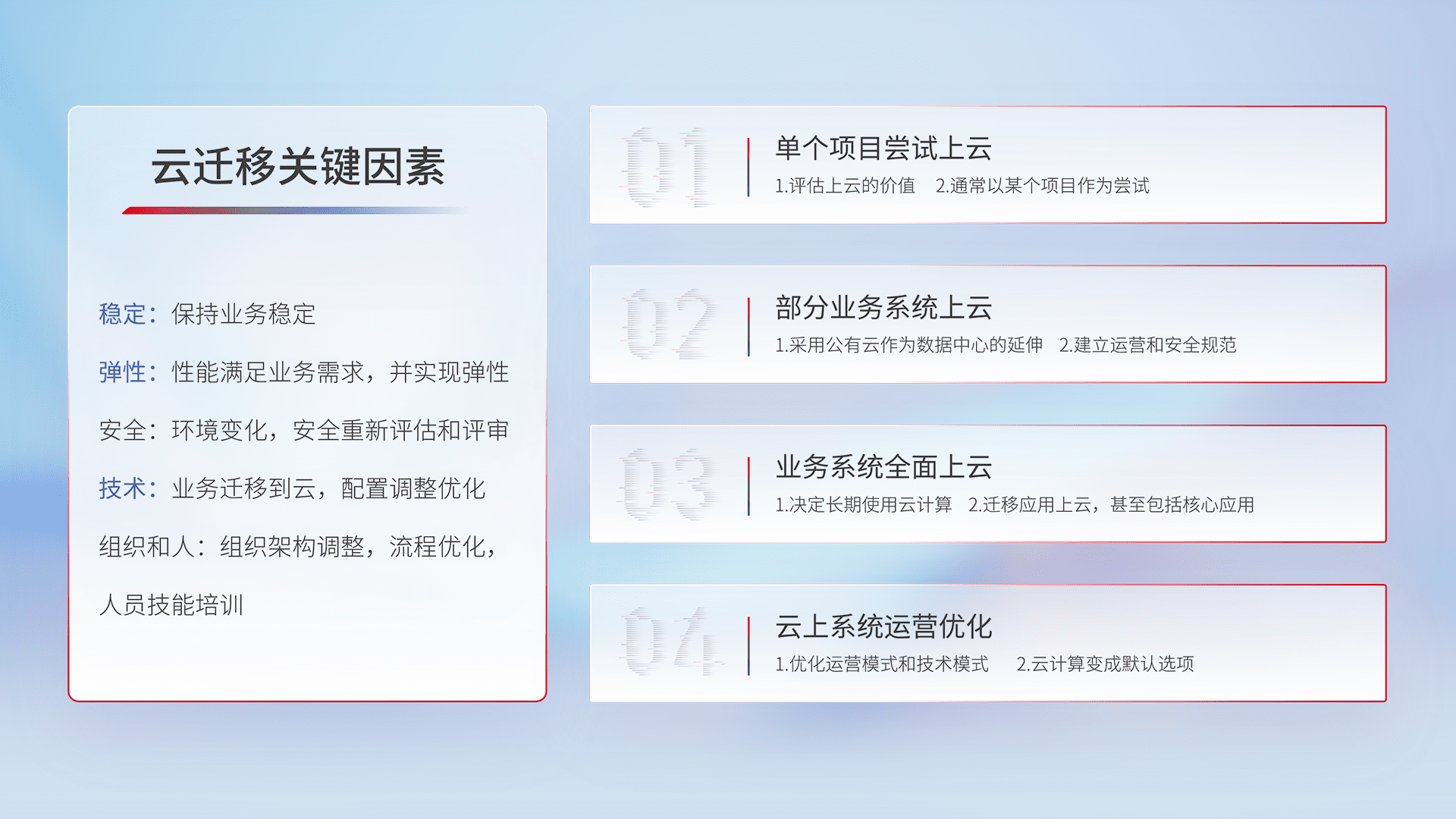 结合实际业务,,从规划设计、、、、云平台选型、、云原生改造、、数据迁移、、集成交付,,,迁移全过程为客户识别最佳上云路径,,,做好风险识别管理,,设计网络架构、、、、身份权限、、安全审计合规、、、、操作审计、、、日志审计、、、、监控告警策略、、多站点容灾设计等,,,,对云上基础设施进行整体规划,,提升IT治理水平,,,,以满足弹性、、、高可用、、高性能的需求。。